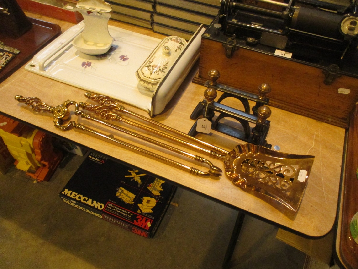 Set of 3 Copper and Brass Fire Irons and Fire Dogs