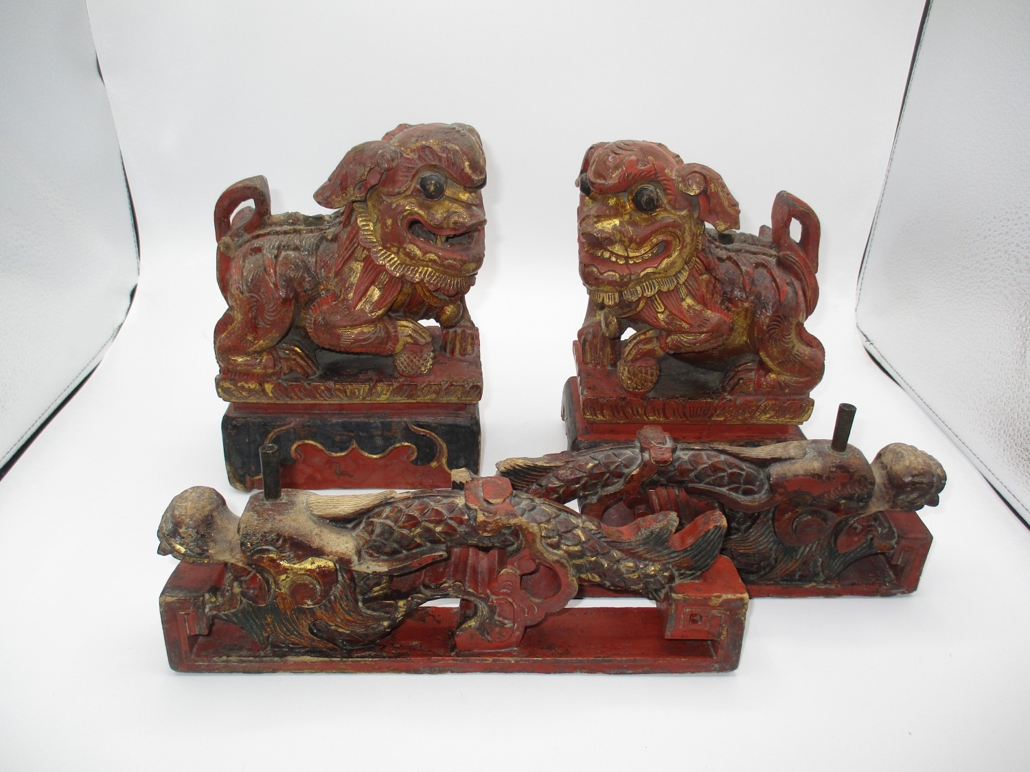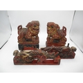 Pair of Chinese Carved Wood Dogs of Fo, 20cm h, and a Pair of Dragon Mouldings