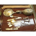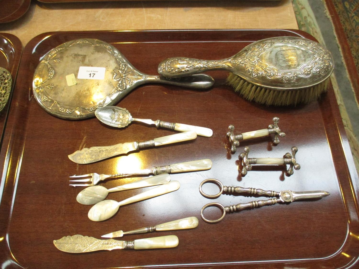 Silver Back Hand Mirror and Brush, Mother of Pearl Handle Cutlery, Knife Rests and Grape Scissors
