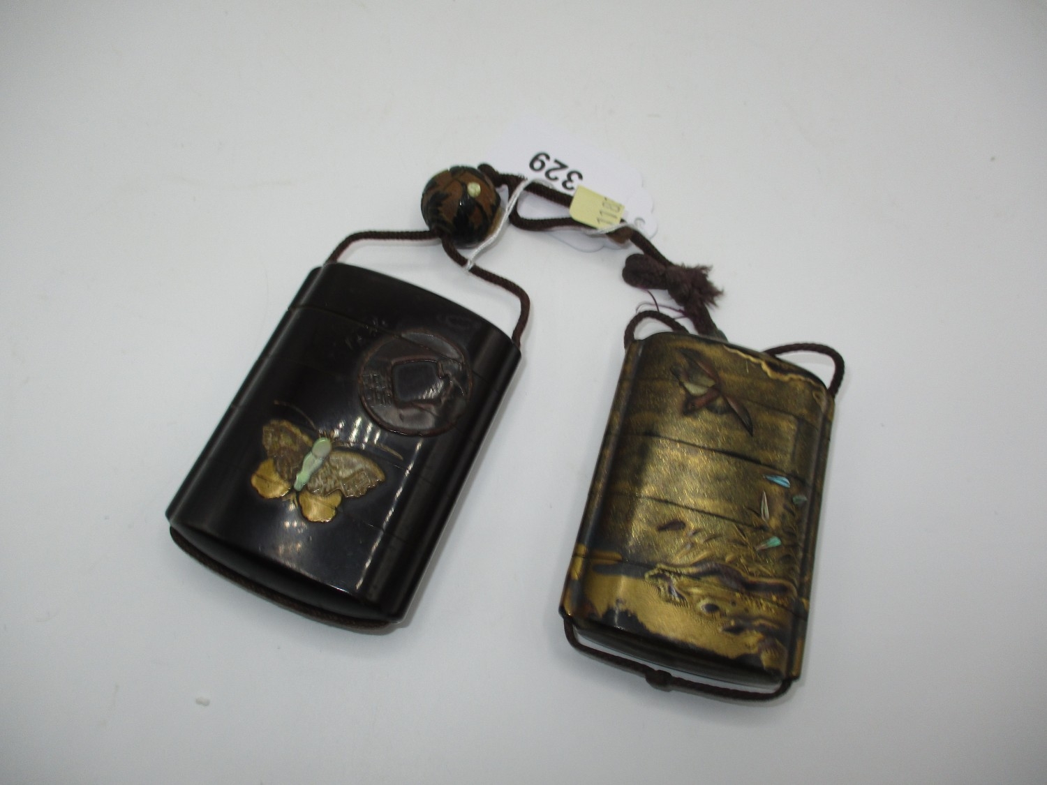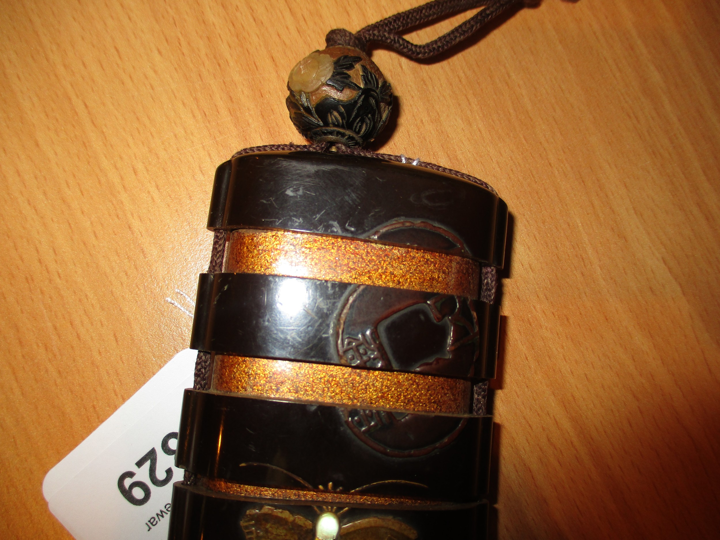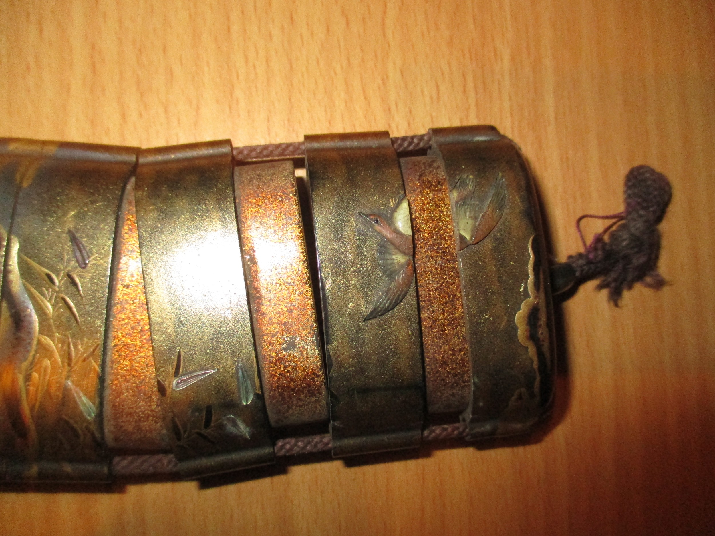 gilt rubbing, the bird inro has a very small chip to the base rim, string on both poor