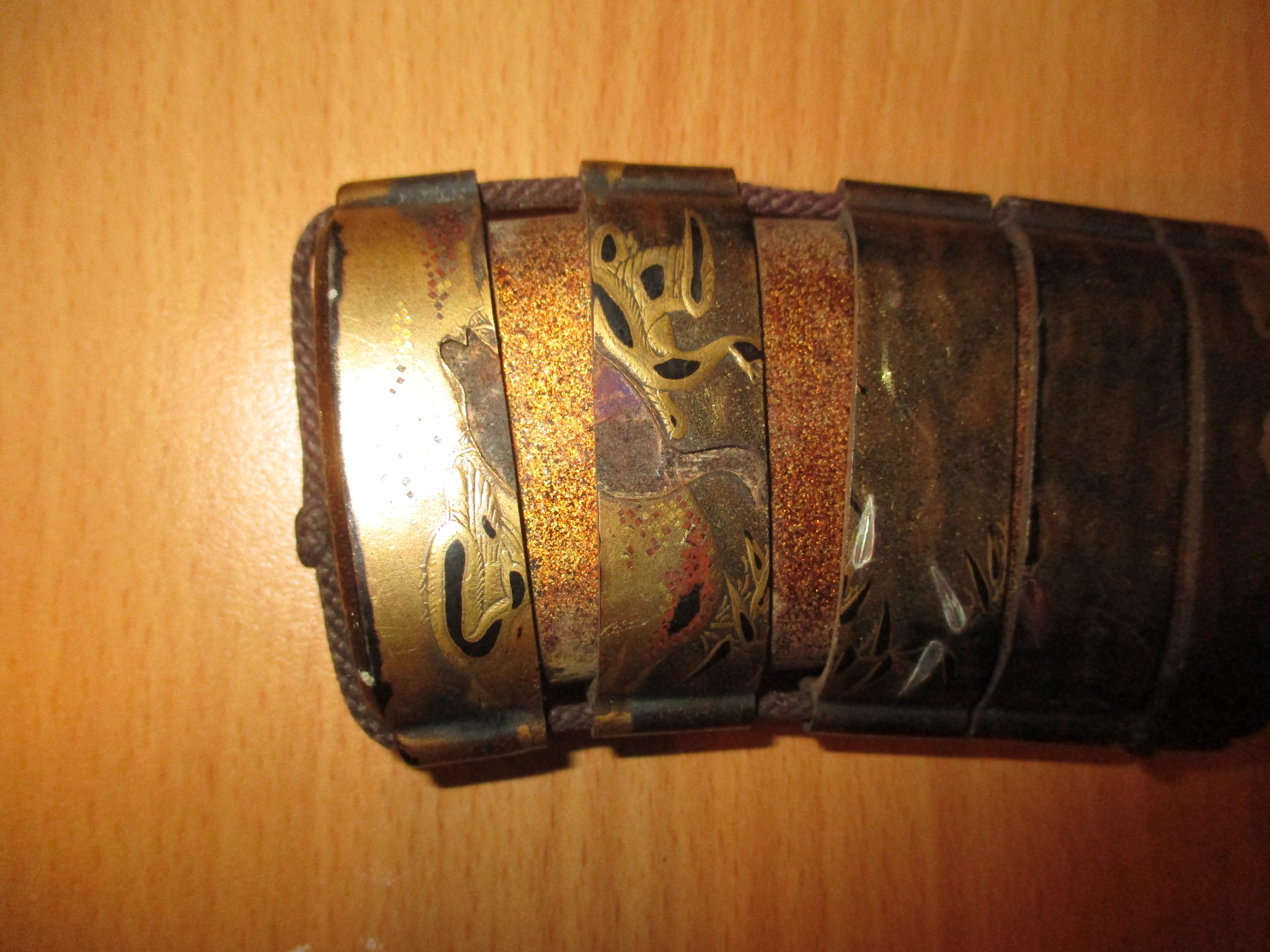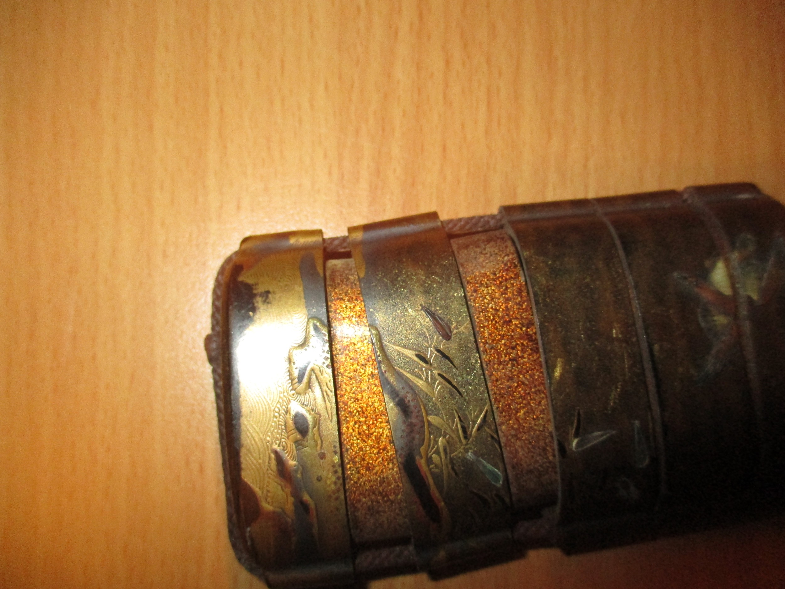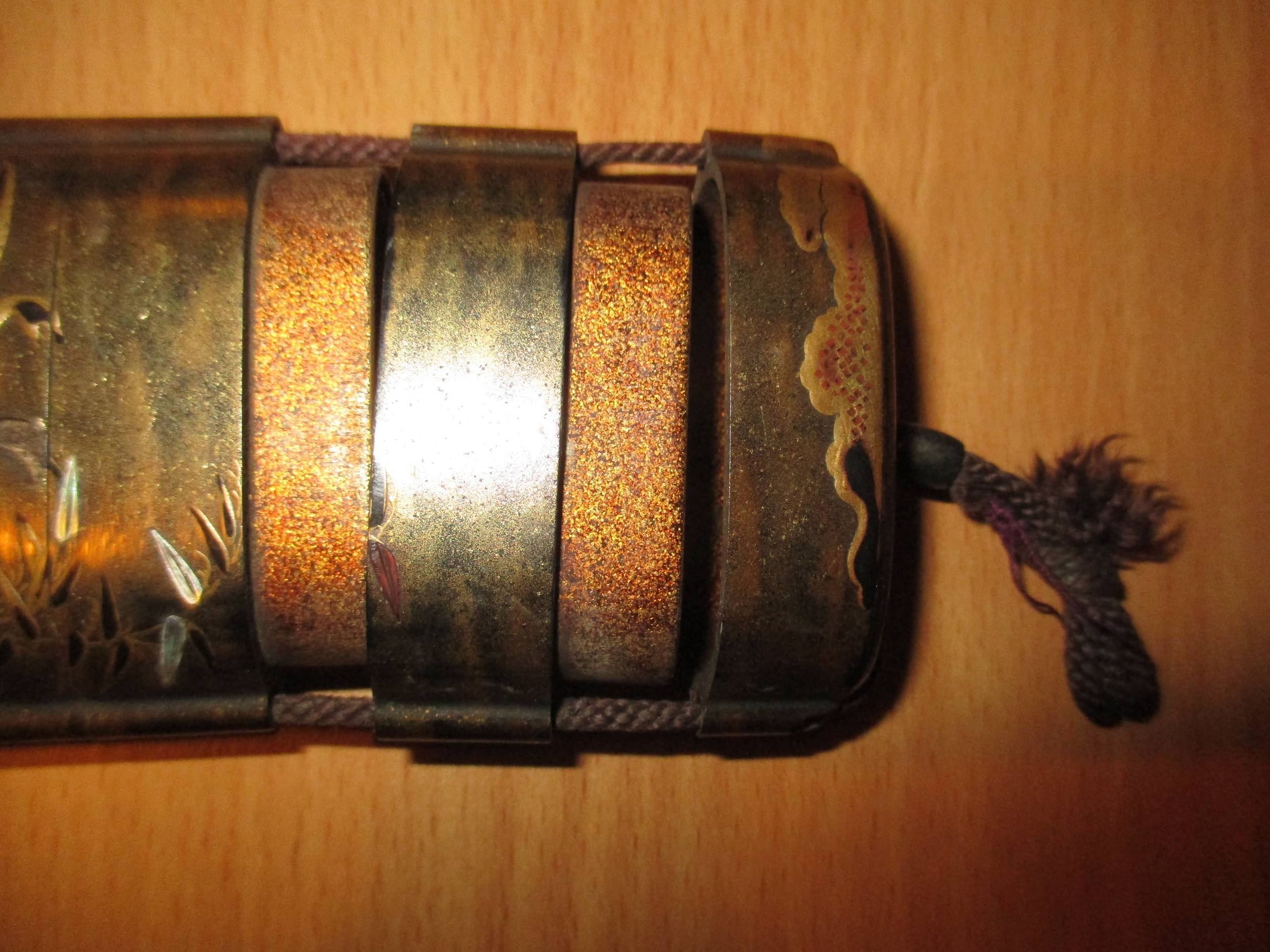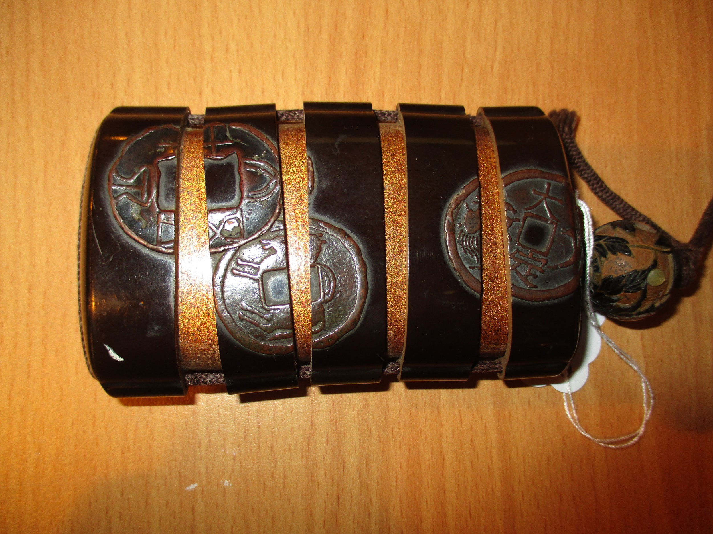 gilt rubbing, the bird inro has a very small chip to the base rim, string on both poor
