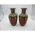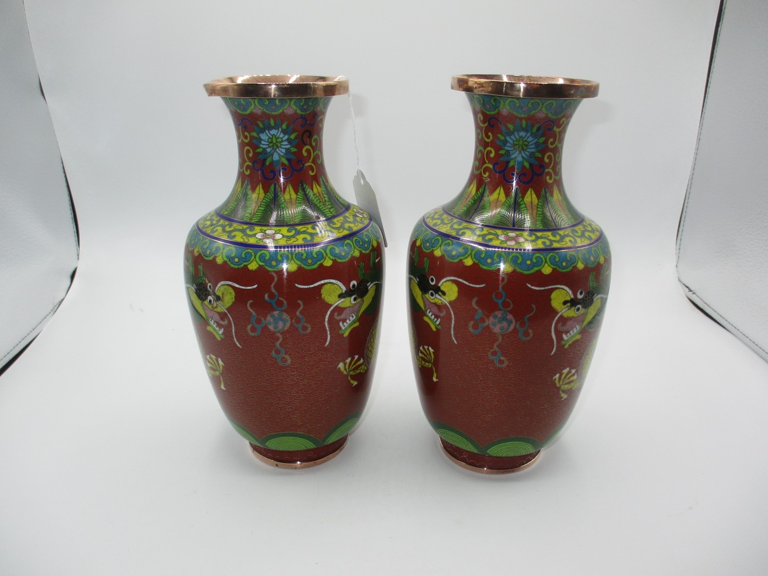 Pair of Cloisonne Enamel Dragon Vases, one dented, 23cm
