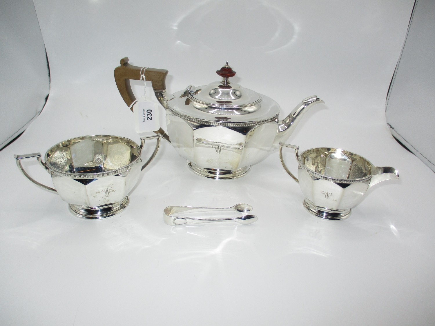 Hamilton & Inches Silver 3 Piece Tea Service, Edinburgh 1930, along with Silver Sugar Tongs, 1030g total